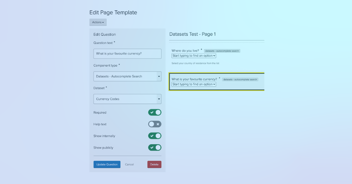 - Datasets: Multiple sets of key-value data pairs can be controlled in a single place and reused across multiple forms.